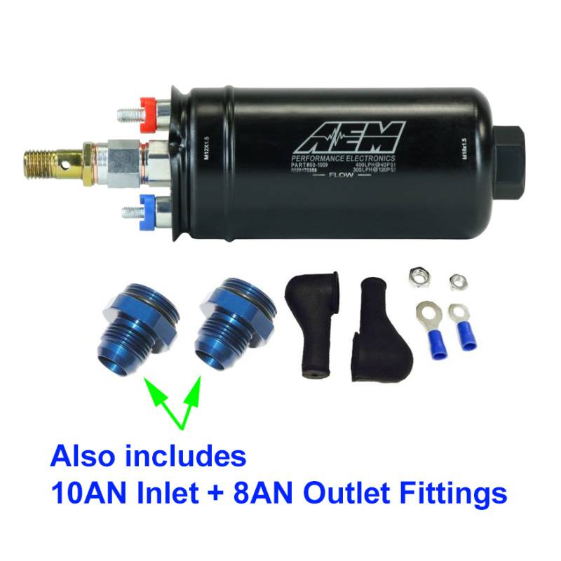 GENUINE AEM 400LPH Inline Fuel Pump +10AN Inlet / 8AN Outlet Fittings, 50-1009
